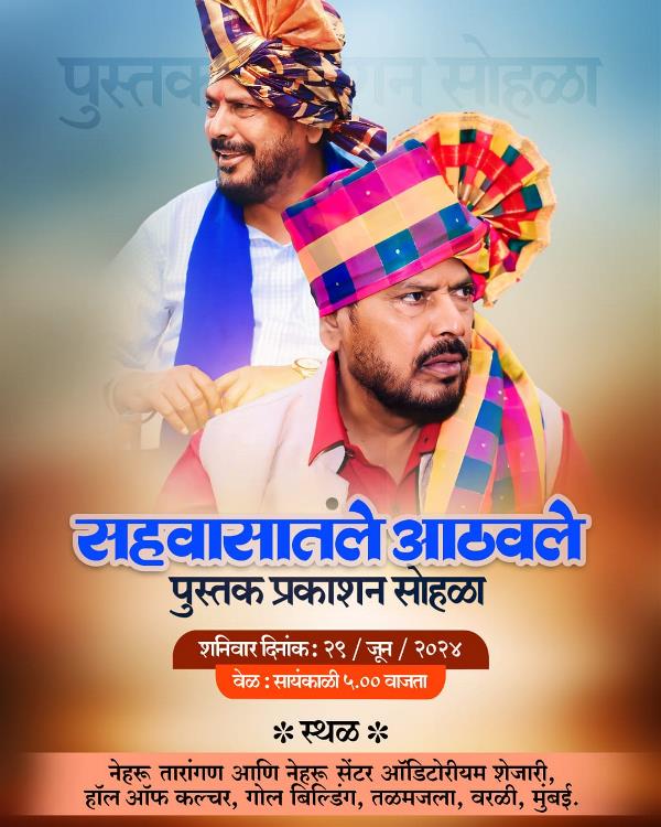 सहवासातले आठवले पुस्तक प्रकाशन सोहळा शनिवार दिनांक : २९ / जून / २०२४ वेळ : सायंकाळी ५.०० वाजता * स्थळ * नेहरू तारांगण आणि नेहरू सेंटर ऑडिटोरीयम शेजारी, हॉल ऑफ कल्चर, गोल बिल्डिंग, तळमजला, वरळी, मुंबई.