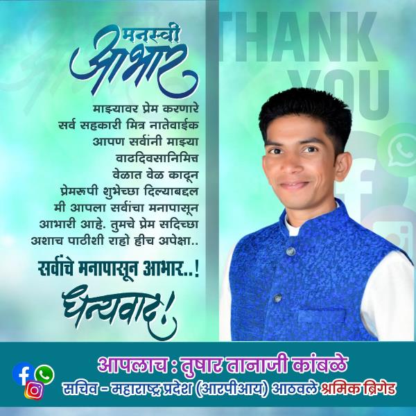 माझ्यावर प्रेम करणारे सर्व सहकारी मित्र नातेवाईक आपण सर्वांनी माझ्या वाढदिवसानिमित्त वेळात वेळ काढून प्रेमरूपी शुभेच्छा दिल्याबद्दल मी आपला सर्वांचा मनापासून आभारी आहे. तुमचे प्रेम सदिच्छा अशाच पाठीशी राहो हीच अपेक्षा..