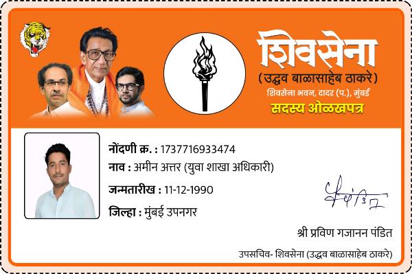 जय महाराष्ट्र ! अमीन अत्तर (युवा शाखा अधिकारी)! आपली शिवसेना (उद्धव बाळासाहेब ठाकरे) पक्षाची प्राथमिक सदस्य नोंदणी पूर्ण झाली आहे. आपले नोंदणी प्रमाणपत्र डाउनलोड करावे. धन्यवाद, शिवसेना (उद्धव बाळासाहेब ठाकरे)