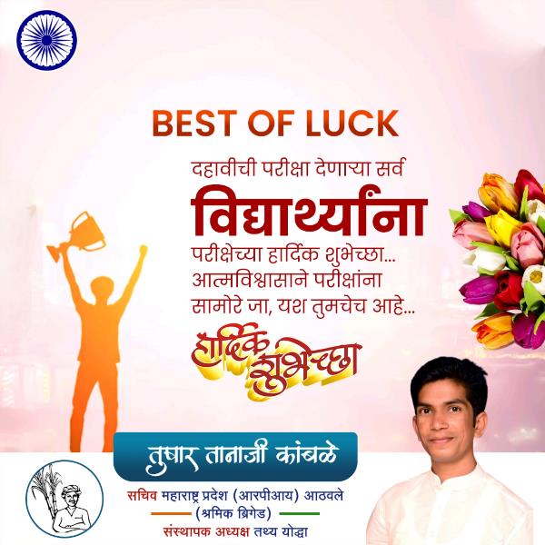 BEST OF LUCK दहावीची परीक्षा देणाऱ्या सर्व विद्यार्थ्यांना परीक्षेच्या हार्दिक शुभेच्छा... आत्मविश्वासाने परीक्षांना सामोरे जा, यश तुमचेच आहे... हार्दिक शुभेच्छा